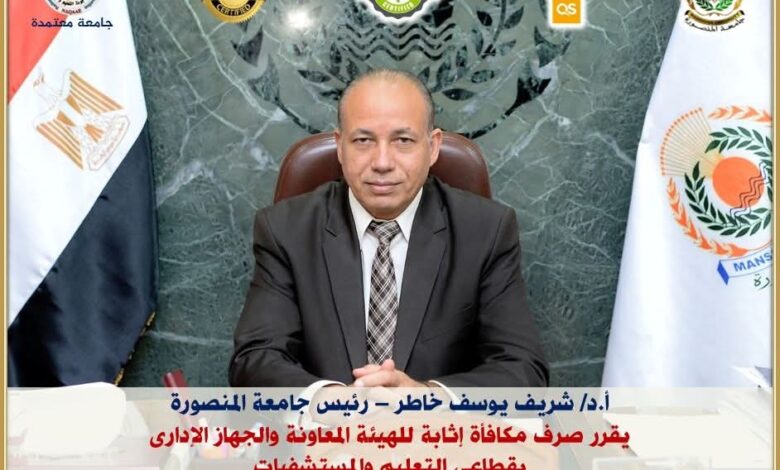 رئيس جامعة المنصورة يقرر صرف مكافأة إثابة للهيئة المعاونة والعاملين بالجهاز الإداري تقديرًا لجهودهم
