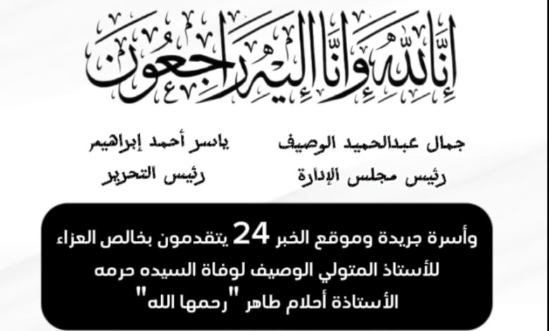 تتقدم أسرة جريدة وموقع الخبر 24 بخالص العزاء في وفاة الأستاذة أحلام طاهر ، وتعزي الجريدة الأستاذ المتولي الوصيف زوجها وأسرتها داعين المولى عز وجل أن يتغمد الفقيدة بالرحمه ويلهم الأهل الصبر والسلوان