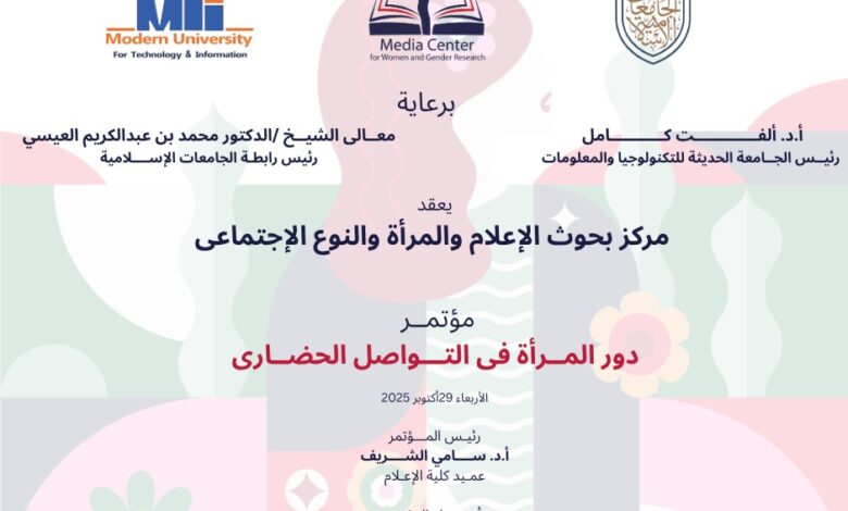 تنطلق بعد غدٍ الأربعاء فعاليات مؤتمر “دور المرأة في التواصل الحضاري” الذي ينظمه مركز بحوث الإعلام والمرأة والنوع الاجتماعي بكلية الإعلام في الجامعة الحديثة للتكنولوجيا والمعلومات (MTI)، تحت رعاية الأستاذة الدكتورة ألفت كامل رئيس الجامعة، ومعالي الشيخ الدكتور محمد بن عبد الكريم العيسى رئيس رابطة الجامعات الإسلامية.