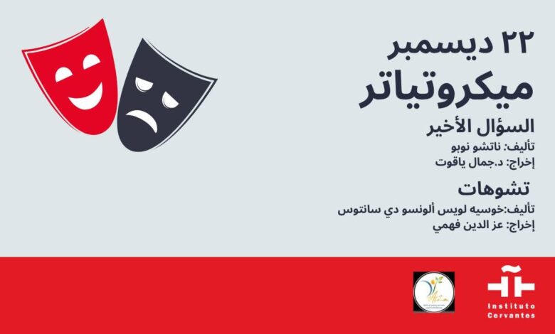 يختتم معهد ثربانتس بالقاهرة غداً الإثنين، ٢٢ ديسمبر، برنامجه السنوي لعروض المايكروتياترو لعام ٢٠٢٥ بجلسة خاصة تُقام في مقر المعهد بالدقي عند الساعة السابعة مساءً، حيث تُعرض مسرحيتان لاثنين من أبرز كتّاب هذا الفن المسرحي القصير: “السؤال الأخير” للكاتب الإسباني نانتشو نوبو و”تشوهات” للكاتب الكبير خوسيه لويس ألونسو دي سانتوس. الدعوة عامة والدخول مجاني حتى اكتمال العدد، على أن يُسمح بالدخول بعد بدء العرض فقط في فترة التوقف الأولى. وتُقدَّم المسرحيتان باللغة العربية دون ترجمة.