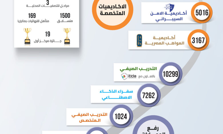 كما شهد برنامج التدريب الصيفي لعام 2025 تخريج أكثر من 10299 متدربًا من طلبة الجامعات والمعاهد، بالتعاون مع هيئة تنمية صناعة تكنولوجيا المعلومات (إيتيدا)، عبر أكثر من 27 مسارًا تدريبيًا حديثًا، وبمشاركة متدربين من جميع محافظات الجمهورية، إلى جانب تنفيذ برامج تدريب صيفي متخصصة بالتعاون مع الجامعات الخاصة والأهلية، استفاد منها 1024 طالبًا. وفي الإطار نفسه، أسهمت مبادرة رفع القدرات في تخريج 2476 متدربًا جديدًا، دعمًا لمواءمة المهارات مع المتطلبات المتسارعة لسوق العمل.