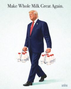 ونشر البيت الأبيض صورة لترامب وهو يحمل عبوات حليب بشعار «لنجعل الحليب كامل الدسم عظيماً مرة أخرى»، في محاكاة لشعاره الانتخابي الشهير.