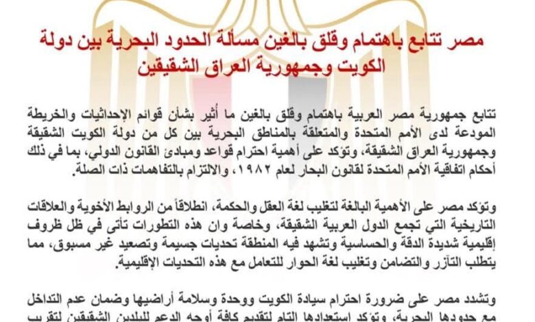 شددت مصر، على ضرورة تغليب لغة الحوار والحكمة في معالجة أي خلافات، خاصة في ظل التحديات الإقليمية الراهنة، مؤكدة أهمية احترام سيادة الكويت ووحدة وسلامة أراضيها وعدم التداخل مع حدودها البحرية.