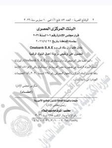 نشرت جريدة الوقائع المصرية قرارا رقم 106 لسنة 2026، بشأن موافقة البنك المركزي المصري على منح ترخيص لـ “وان بنك” (Onebank S.A.E) لمزاولة أعمال البنوك الرقمية داخل مصر.