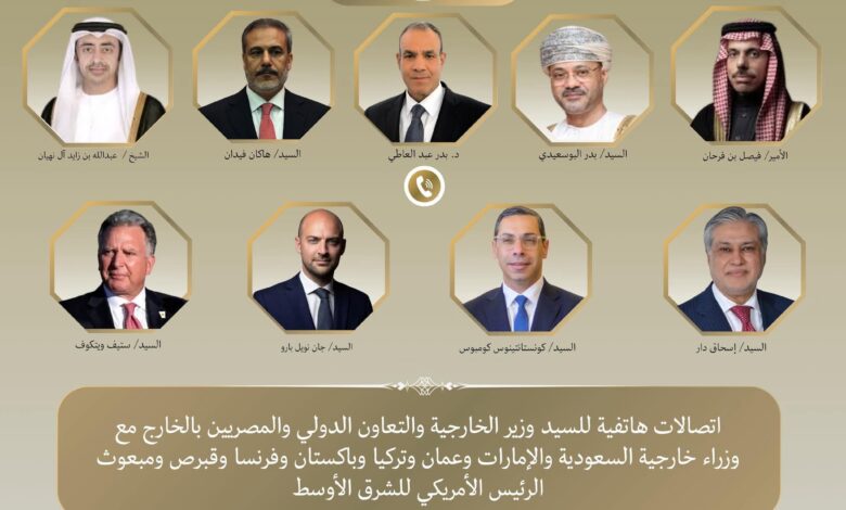 جرت اتصالات هاتفية بين د. بدر عبد العاطي وزير الخارجية والتعاون الدولي والمصريين بالخارج، وكل من الشيخ عبد الله بن زايد نائب رئيس الوزراء ووزير خارجية الإمارات العربية المتحدة الشقيقة، والأمير فيصل بن فرحان وزير خارجية المملكة العربية السعودية الشقيقة، والسيد بدر البوسعيدي وزير خارجية سلطنة عُمان الشقيقة، والسيد هاكان فيدان وزير خارجية الجمهورية التركية، والسيد إسحاق دار نائب رئيس الوزراء ووزير خارجية جمهورية باكستان الإسلامية، والسيد جان نويل بارو وزير خارجية الجمهورية الفرنسية، والسيد كونستانتينوس كومبوس وزير خارجية قبرص، بالإضافة إلى السيد ستيف ويتكوف المبعوث الأمريكي الخاص للشرق الأوسط، يوم الاثنين ٢٣ مارس الجاري.
