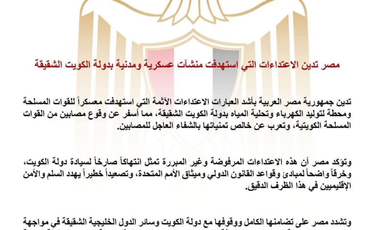تدين جمهورية مصر العربية بأشد العبارات الاعتداءات الآثمة التي استهدفت معسكراً للقوات المسلحة ومحطة لتوليد الكهرباء وتحلية المياه بدولة الكويت الشقيقة، مما أسفر عن وقوع مصابين من القوات المسلحة الكويتية، وتعرب عن خالص تمنياتها بالشفاء العاجل للمصابين.