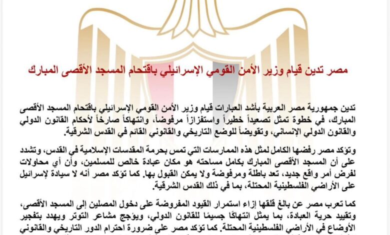 تدين جمهورية مصر العربية بأشد العبارات قيام وزير الأمن القومي الإسرائيلي باقتحام المسجد الأقصى المبارك، في خطوة تمثل تصعيداً خطيراً واستفزازاً مرفوضاً، وانتهاكاً صارخاً لأحكام القانون الدولي والقانون الدولي الإنساني، وتقويضاً للوضع التاريخي والقانوني القائم في القدس الشرقية.