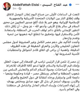 وأضاف رئيس الجمهورية: إن مصر إذ تثمن قرار الرئيس ترامب فى الإصغاء إلى صوت العقل وإعلاء قيم الإنسانية والسلام، فإنها تدعو كافة الأطراف للانخراط بجدية فى المباحثات، وصولا للسلام الدائم والتعايش السلمي بين شعوب المنطقة والعالم. وستظل مصر – قيادة وحكومة وشعبا – داعمة لأمن واستقرار ورخاء أشقائنا في دول الخليج والعراق والأردن، وسوف أستمرّ في بذل كل جهد صادق ومخلص يهدف إلى إنهاء الصراعات وإرساء السلام العادل والشامل في منطقتنا وفي العالم بأسره.