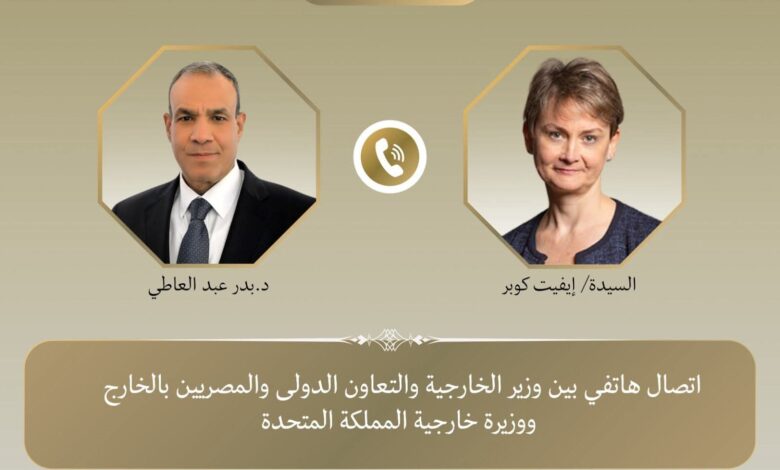 تلقى د. بدر عبد العاطي وزير الخارجية والتعاون الدولي والمصريين بالخارج اتصالاً هاتفياً من السيدة “إيفيت كوبر”، وزيرة خارجية المملكة المتحدة، يوم السبت ١١ أبريل، وذلك في إطار التشاور الدوري بين الجانبين، حيث تناولا سبل تعزيز العلاقات المصرية البريطانية، ومستجدات الأوضاع في المنطقة في ظل المفاوضات الأمريكية – الإيرانية فى إسلام آباد، بالاضافة إلى التطورات فى قطاع غزة ولبنان والسودان.