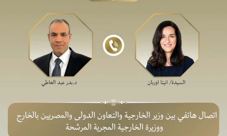 أجرى د. بدر عبد العاطي وزير الخارجية والتعاون الدولي وشئون المصريين بالخارج اتصالاً هاتفيا مع السيدة “أنيتا اوربان” وزيرة الخارجية المجرية المرشحة، يوم السبت ١٨ أبريل، حيث قدم الوزير عبد العاطي التهنئة لها بمناسبة فوز حزبها بالانتخابات البرلمانية المجرية.